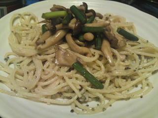 (3) ニンニクの芽、シメジ、舞茸を塩、コショウ、醤油で炒めます。